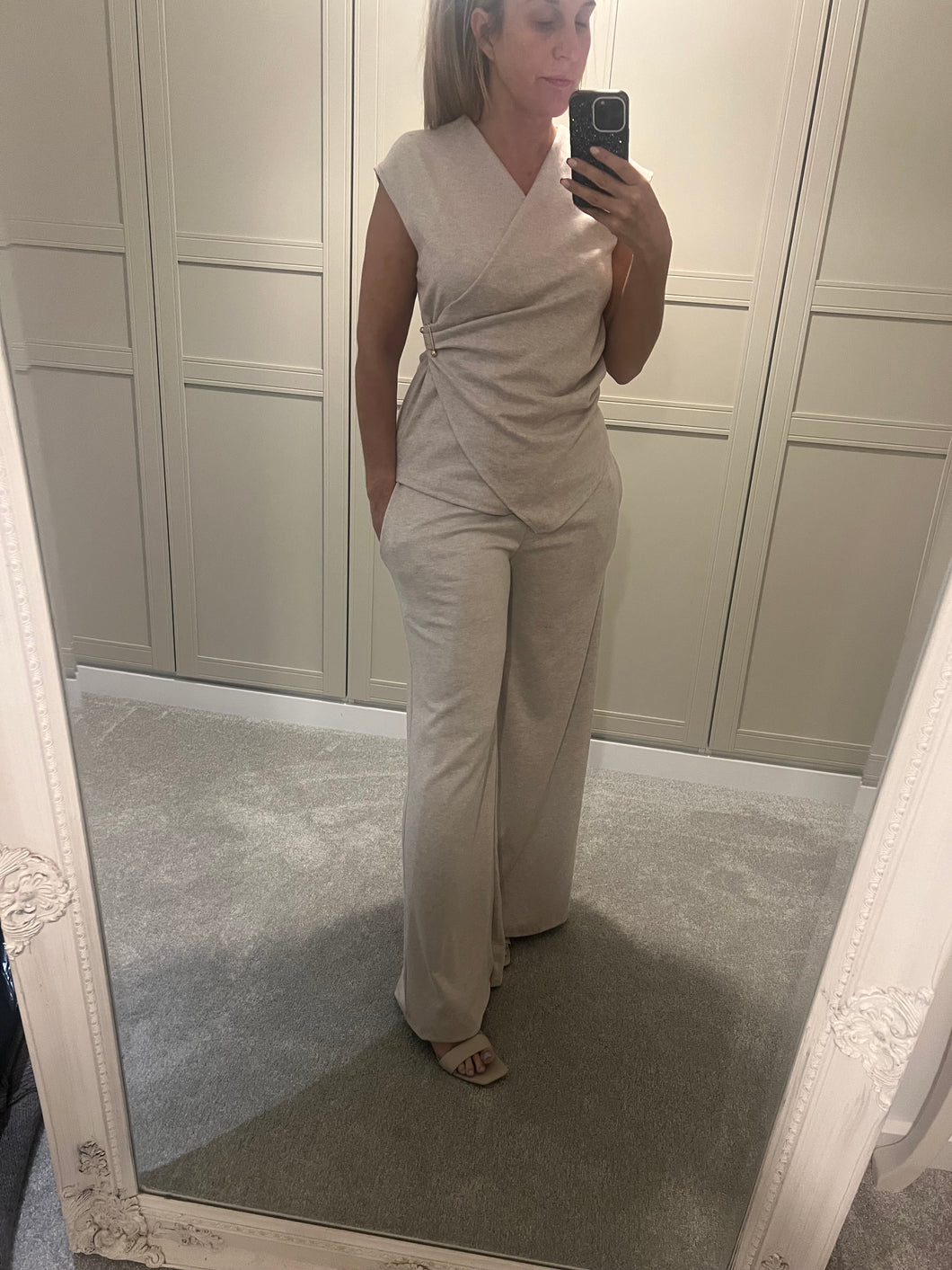 Relaxed sophistication meets all-day comfort in these wide-leg knit trousers. Made from a soft, breathable fabric with a gentle drape, they offer a flattering silhouette that moves effortlessly with you. The high-rise fit and clean lines create a streamlined look, perfect for pairing with the matching wrap top or styling with your favorite blouse or tee. Ideal for both lounging and elevated everyday wear.