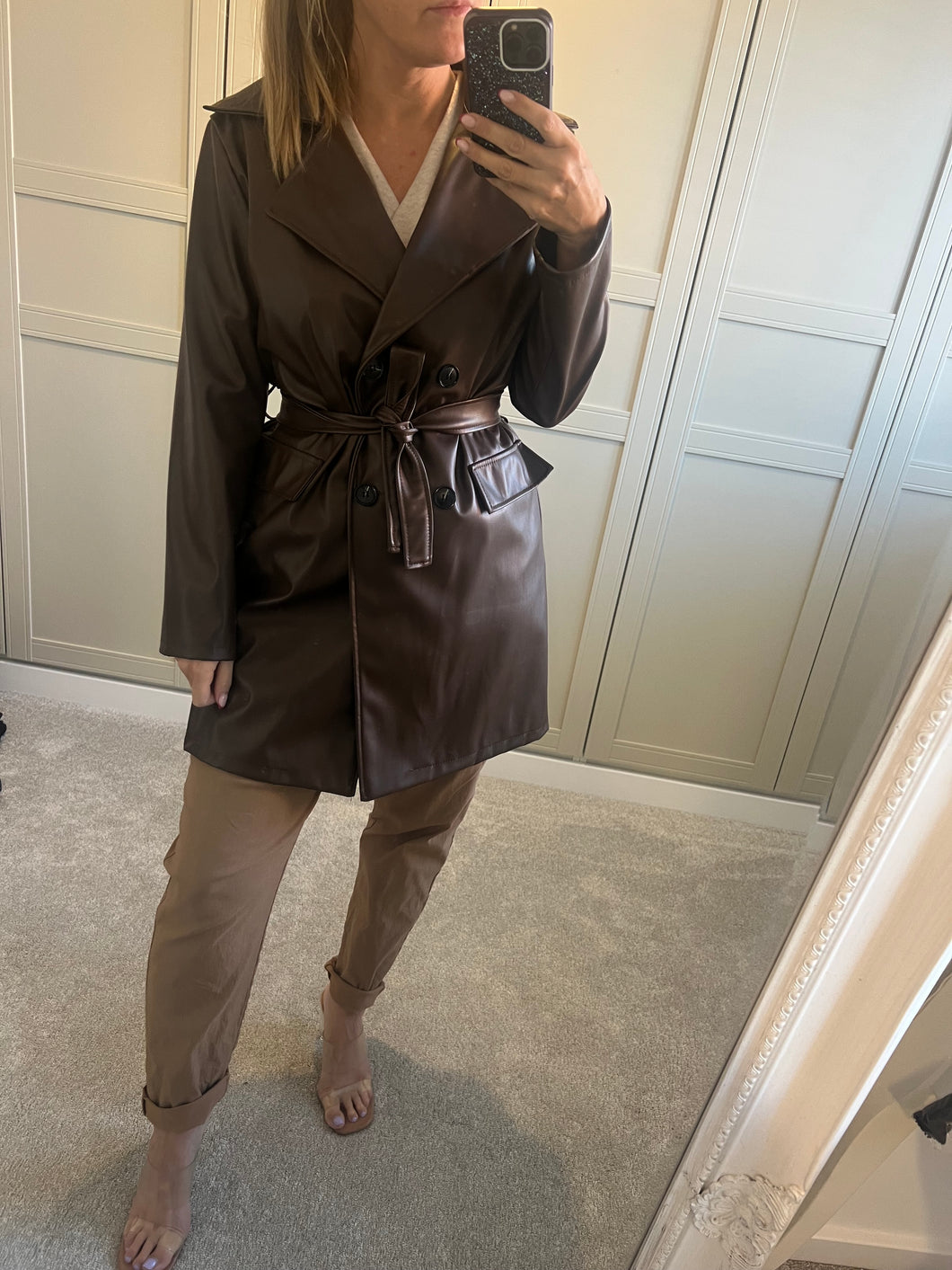Chocolate Brown Faux Leather Trench Coat